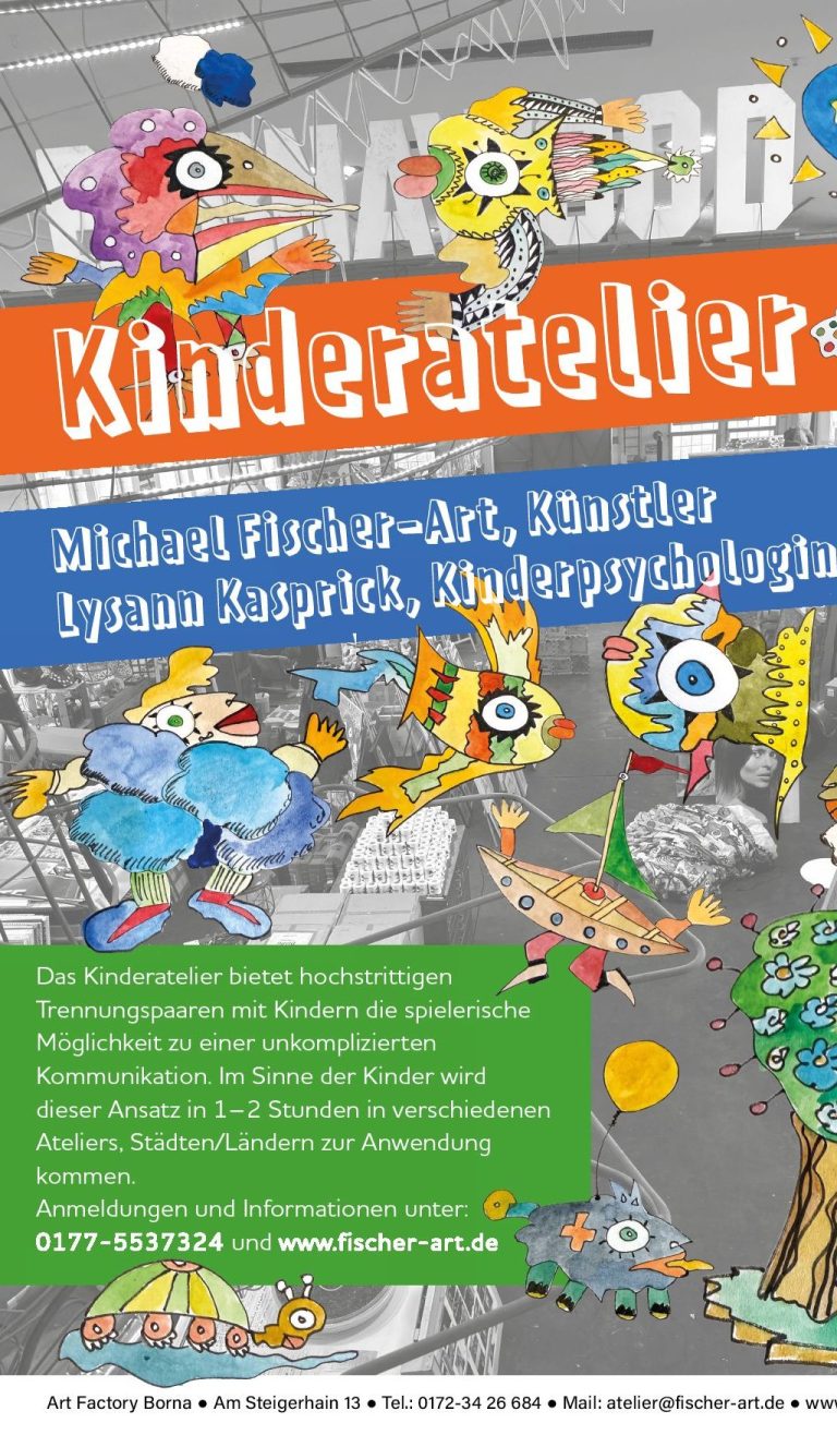 Das Kinderatelier von Fischer-Art bietet eine kreative und spielerische Möglichkeit zur Kommunikation für hochstrittige Trennungsfamilien mit Kindern. In 1–2-stündigen Workshops, geleitet vom Künstler Michael Fischer-Art und der Kinderpsychologin Lysann Kasprick, wird ein kindgerechter Ansatz in verschiedenen Ateliers und Orten umgesetzt. Informationen und Anmeldung unter www.fischer-art.de oder telefonisch unter 0172-3426684